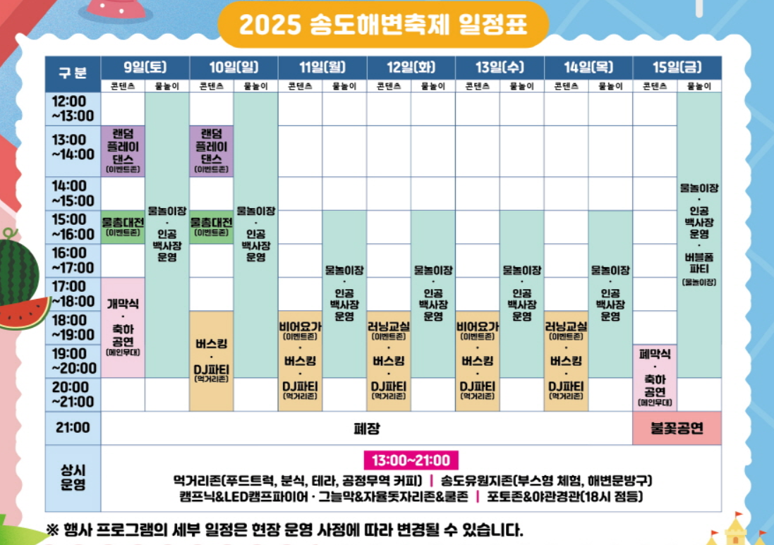 | 물놀이 & 해변존 | 워터슬라이드, 모래 놀이터 등 | 낮 12:00~18:00 |